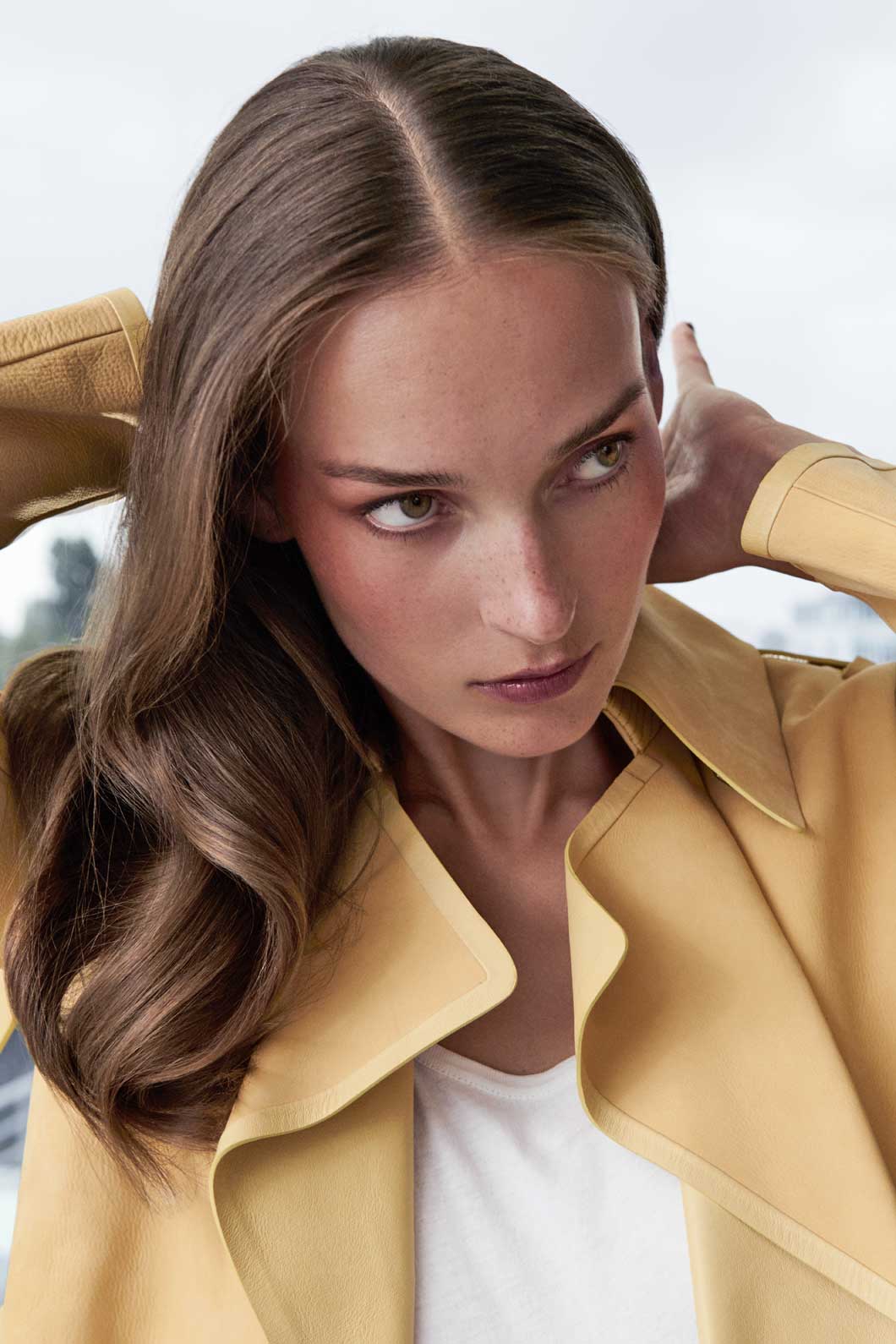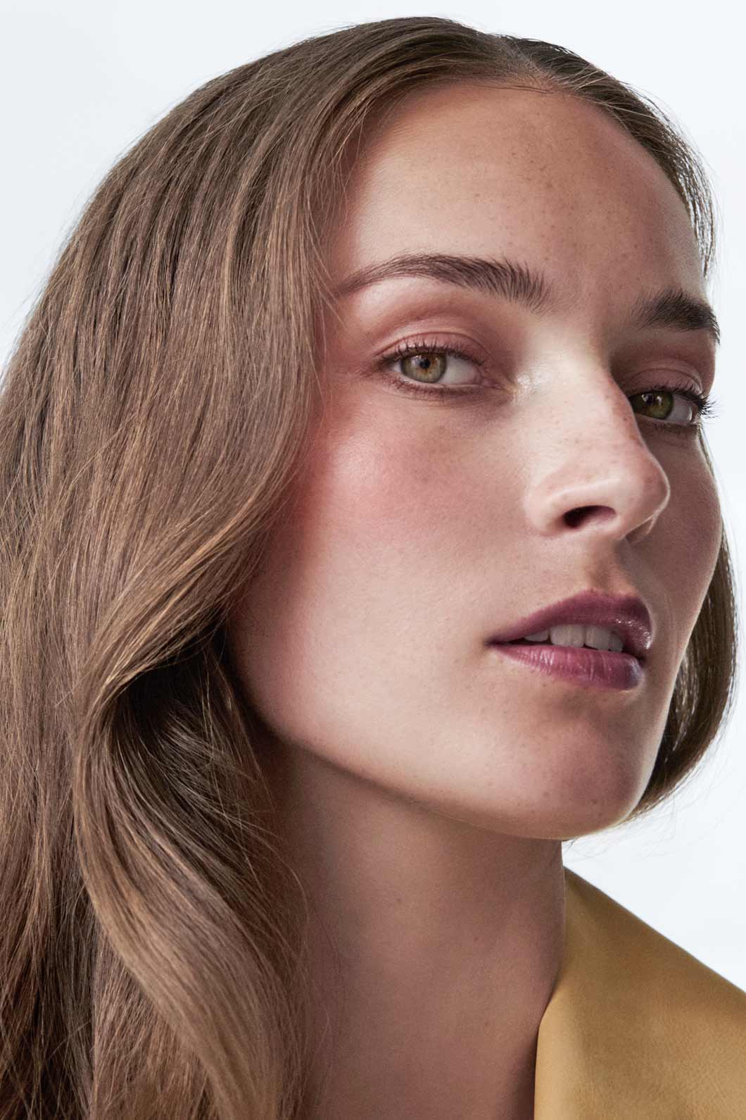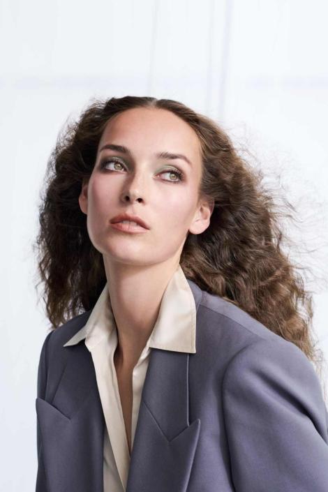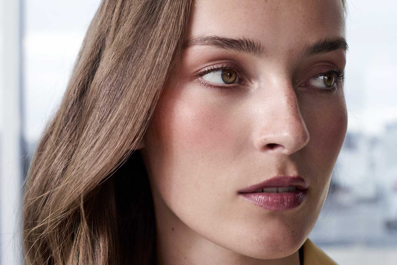 Das harmonische Spiel warmer und kühler Akzente bestimmt diesen Look, von dem eine verlockende Anziehungskraft ausgeht. Tender Blush Golden Amber erwärmt Wangen, Augenlider und Schläfen, während kühles Pencil for Eyes Walnut Silk dem Blick eine selbstsichere Tiefgründigkeit verleiht. Der Mund ist in tiefviolettem Sensual Lipstick B243 Purple Gem gehalten, dem das transparente Korallen-Pink von Lip Shine spiegelnden Glanz und ausdrucksvolle Lebendigkeit verleiht.