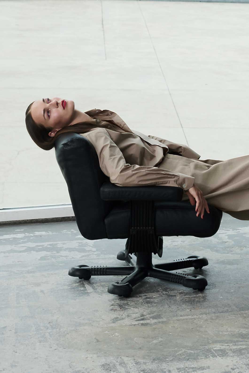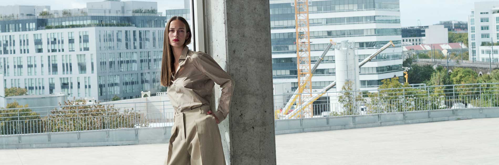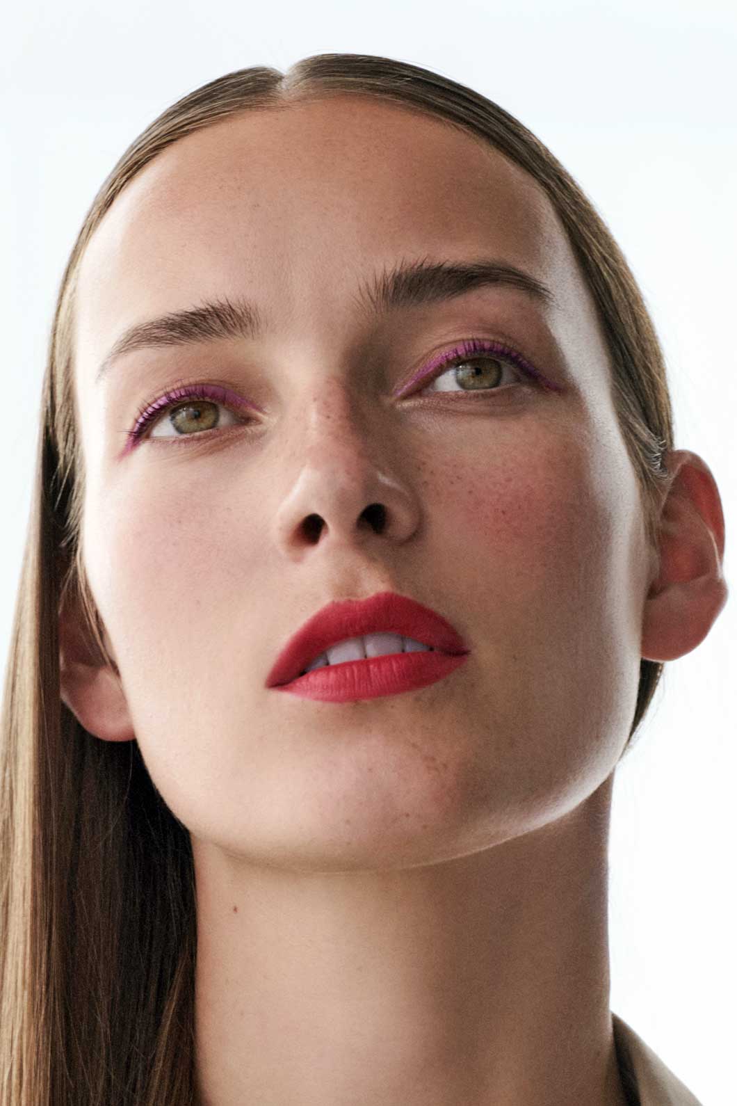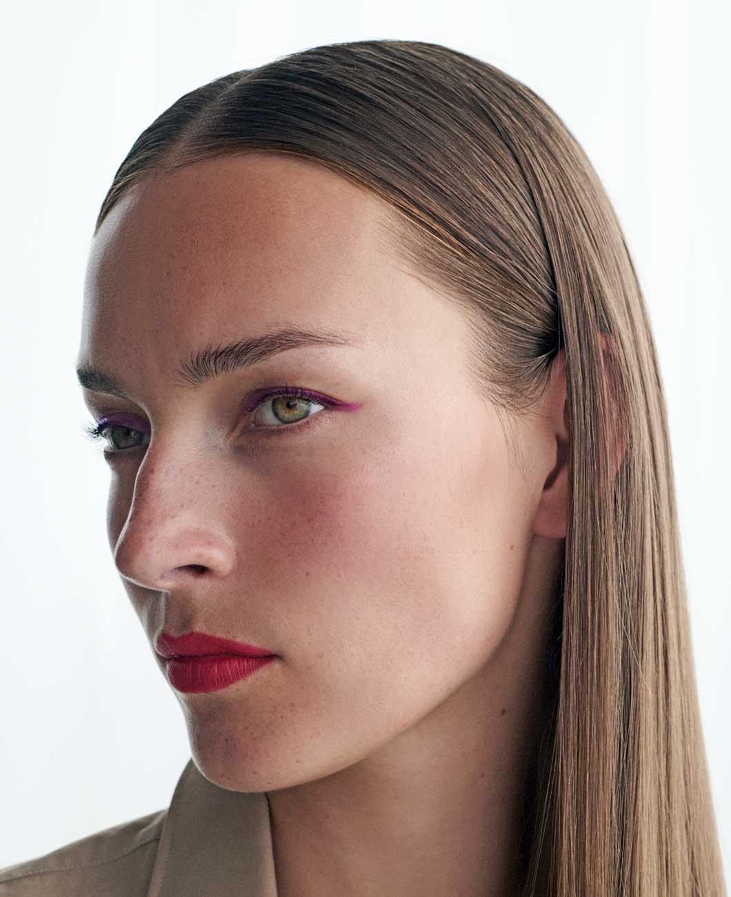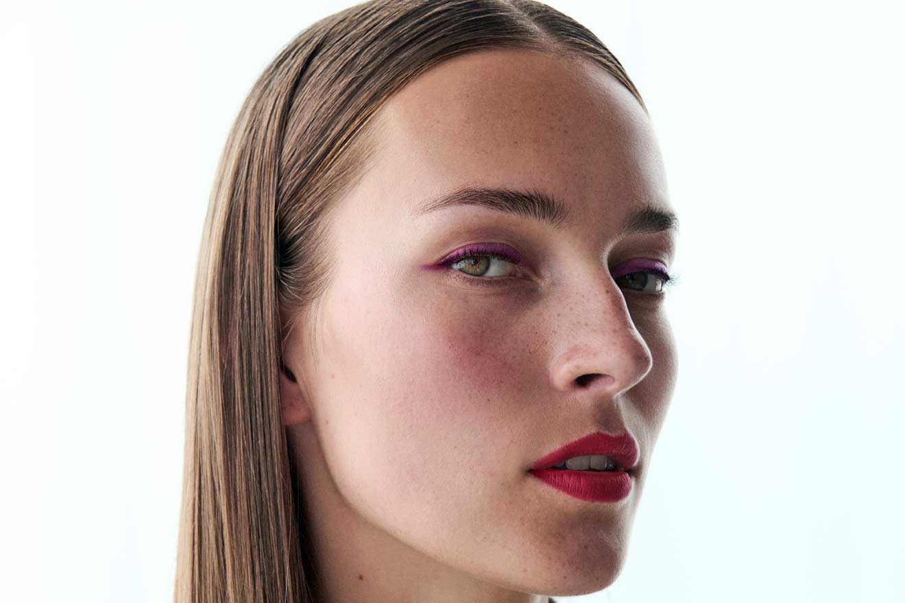 Selbstbewusste Modernität in ausdrucksvollem Rot! Matt und präzise setzt Sensual Lipstick M408 Scarlet den Mund in den Fokus. Ein Ausdruck purer Präsenz, den der Automatic Pencil for Eyes K35 Cranberry in einer klaren Linie am Lidrand entlang fortsetzt und den der Eyeshadow Pen Flare als Highlight auf die Lidmitte setzt. Der sehr natürlich gehaltene Teint und das mit Taming Fluid makellos geglättete Haar unterstreichen den kraftvollen Minimalismus des Looks.